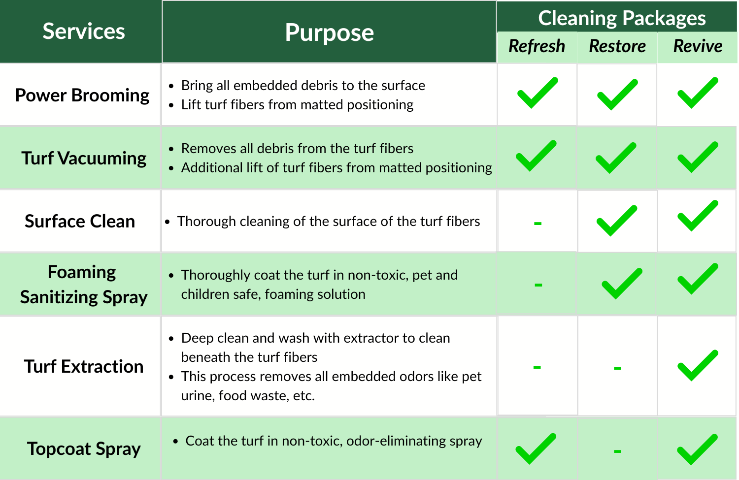 Our standard cleaning packages are straightforward and transparent, making our service offerings easy to understand. We offer three levels of cleanings, each package building on one another to deliver solutions for any turfed area.
